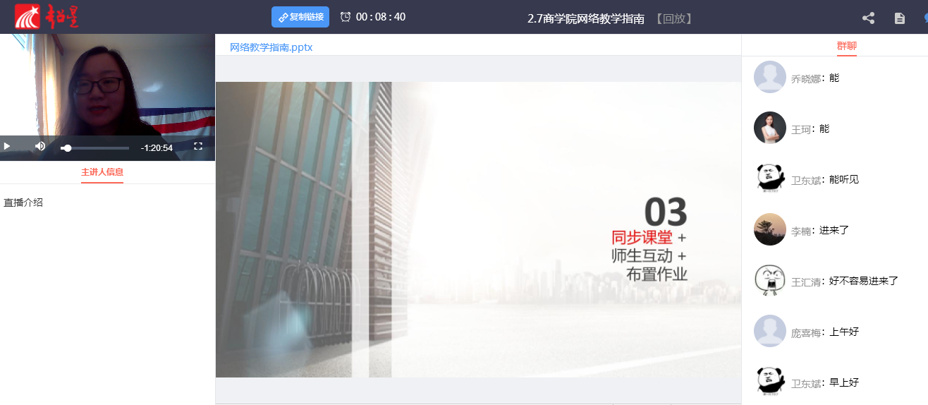 2月7日,吴老师给必赢76net线路官网全体教师做了一堂持续了1个半小时的直播公开课,培训讲解了3种主要的授课模式:直播模式、微课/速课模式、同步课堂模式,必赢76net线路官网教师积极参与答疑,提出了很多网络教学中遇到的问题,吴老师进行了一一解答。总结经验之后,吴老师重新撰写了《教学指南2.0》和《学生学习指南1.0》,分享在必赢76net线路官网QQ群。