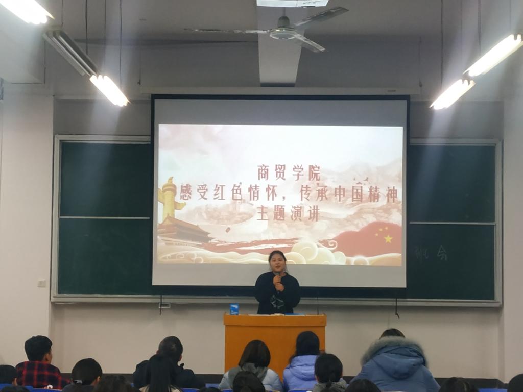 2018年12月27日在b201开展的《感受红色情怀,传承中国精神》演讲比赛,由商贸学院李力老师、刘嘉慧老师、岳晓娜老师、朱海老师担任此次大赛评委,商贸学院全体入党积极分子参加活动。