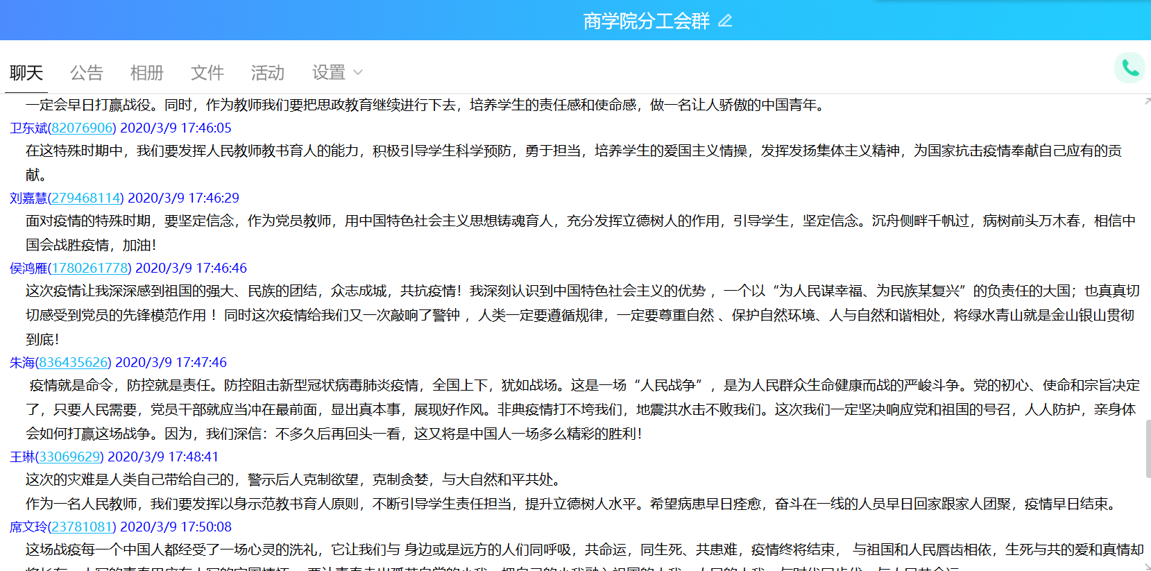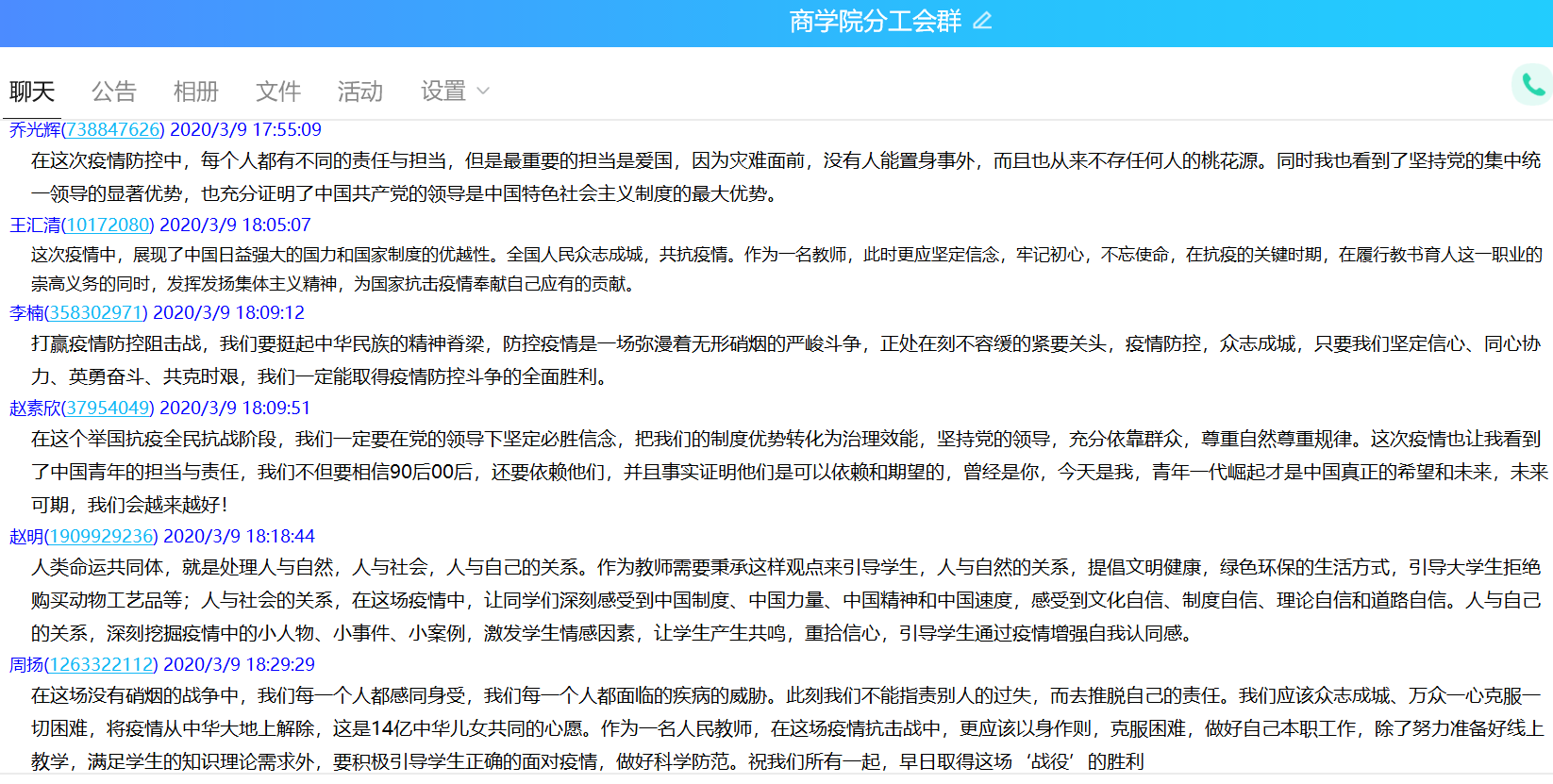 本次“同上一堂疫情防控思政大课”必赢76net线路官网共有28名教师,1531名学生参与观看,其中教师28人均参与了讨论发言,必赢76net线路官网共计41个班级在QQ群、微信群、在线课堂等途径开展了讨论和发言。