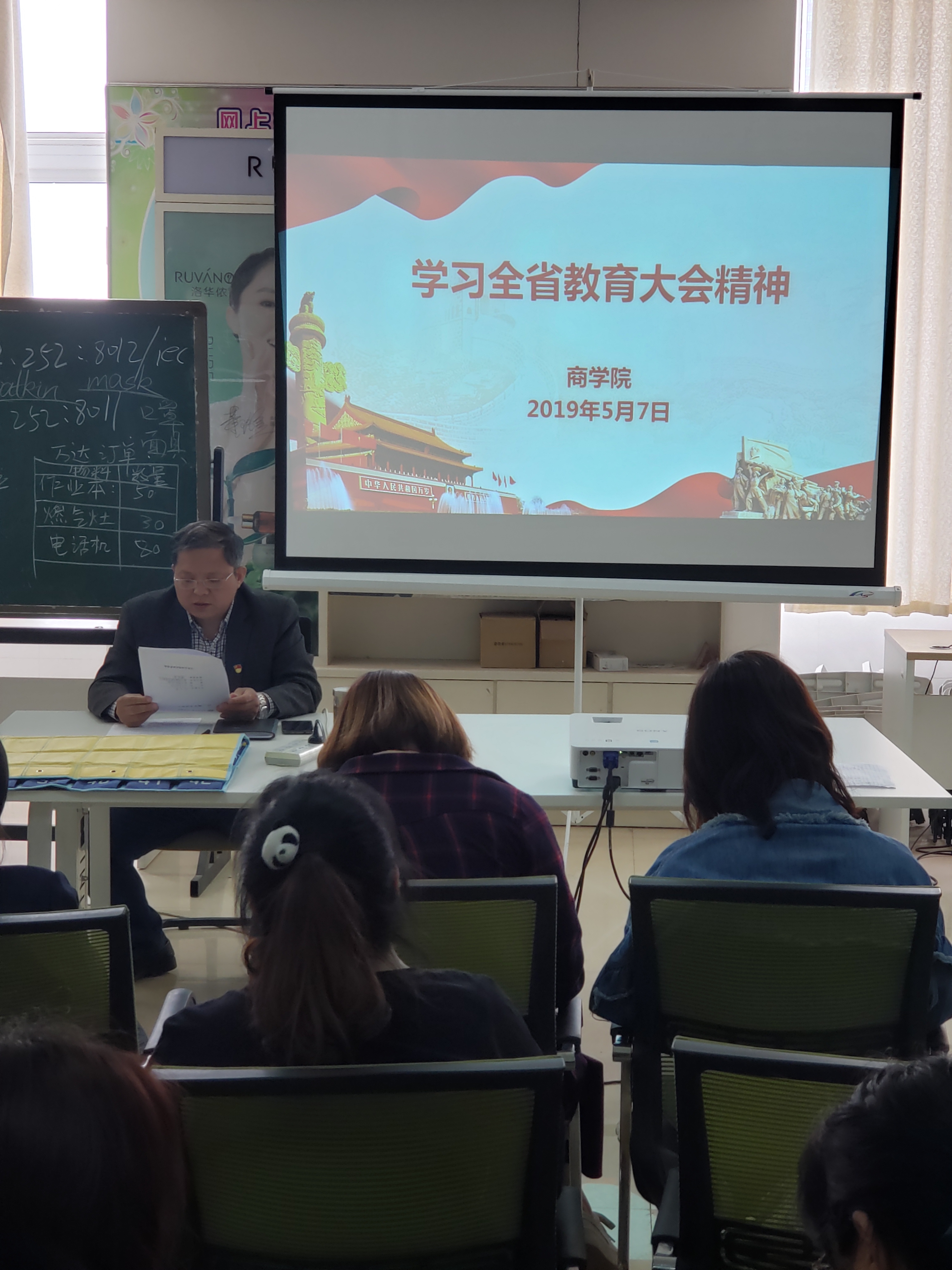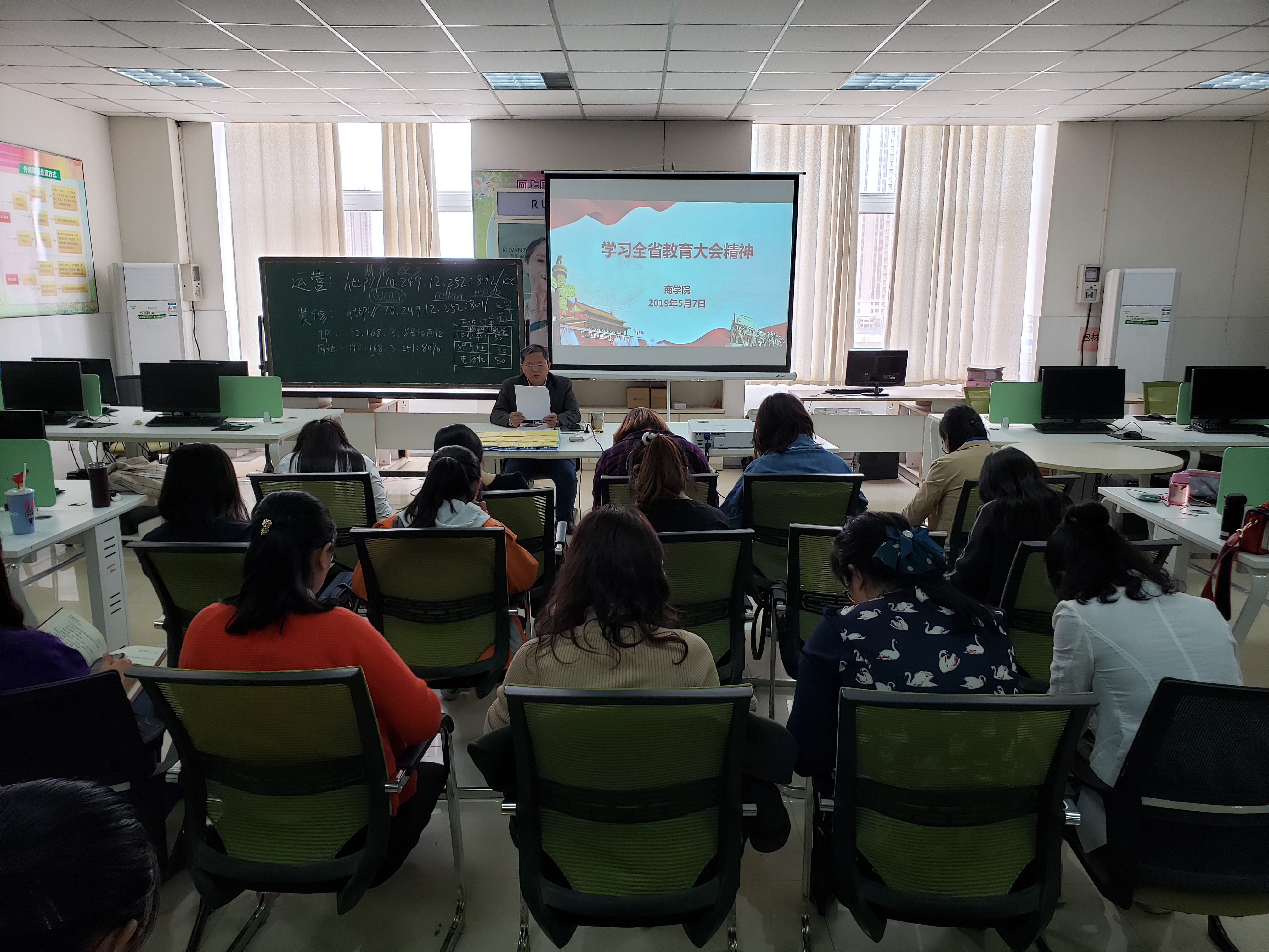 2019年5月7日,必赢76net线路官网全体教职工在E609教室学习全省教育大会精神。必赢76net线路官网院长孙勇同志主持会议。