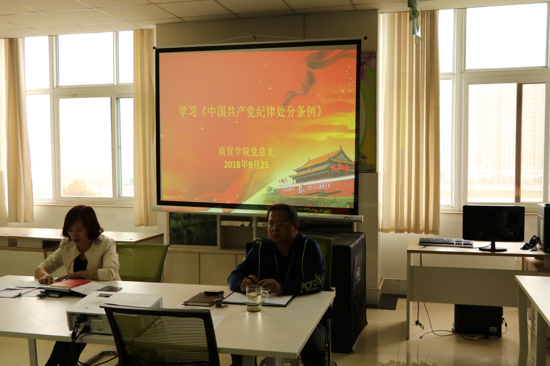 9月26日,按学校工作安排,商贸学院党总支组织全体教职工在E609进行政治学习。本次学习内容包括2018年《高校民族宗教工作知识读本》及《中国共产党纪律处分条例》。学习活动由商贸学院党总支书记周燕同志主持,商贸学院全体教职工参会。