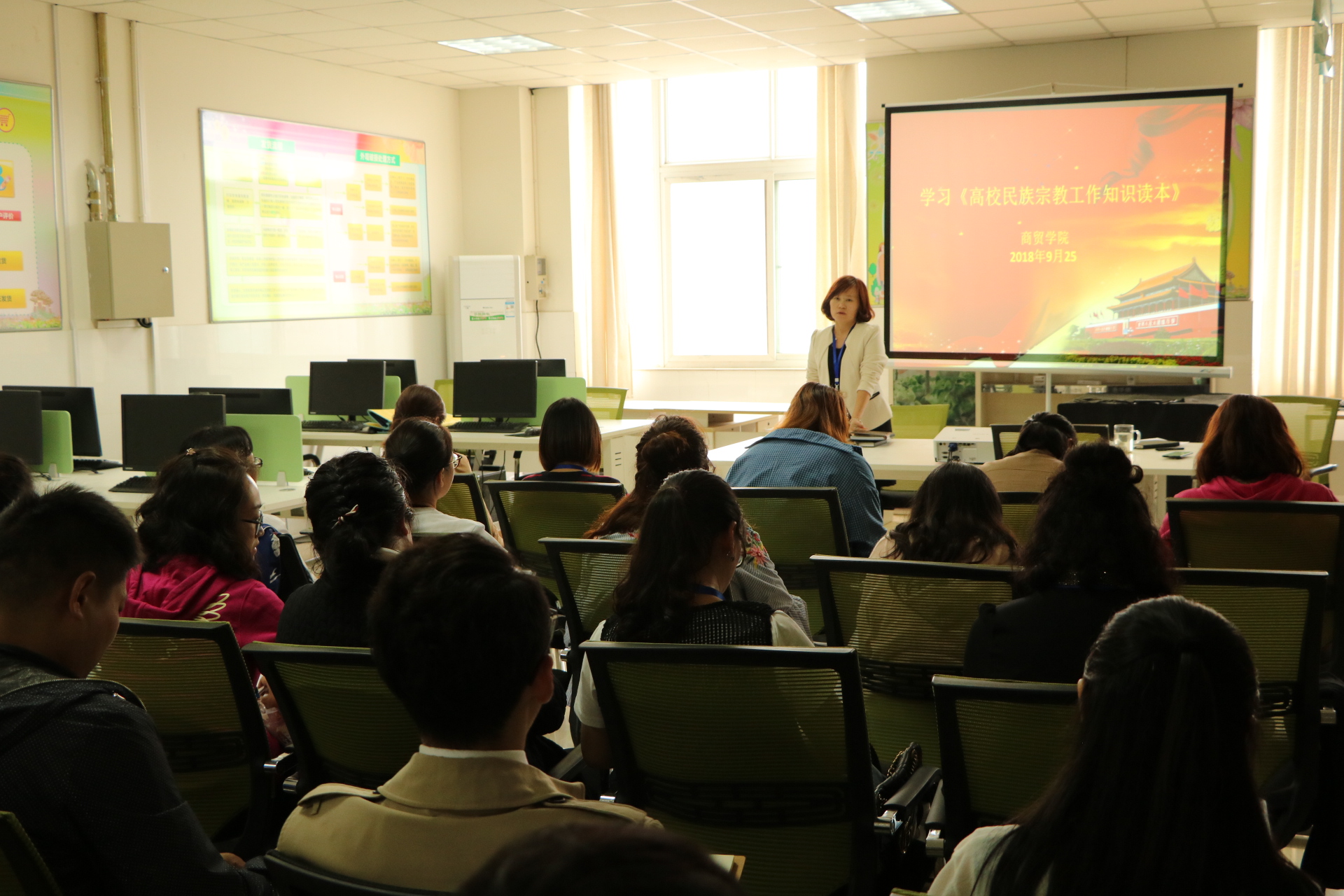 首先周燕书记带领大家共同学习了2018年《高校民族宗教知识读本》,随后在发言中指出了加强高校宗教工作的重要性和严峻性,要求全体教职工要加强学习,思想和行动上要和党中央保持高度一致,根据当前形势发展需要,认真学习民族宗教政策和法律法规知识,全面提升自身理论水平,认真履行好岗位职责,坚守教育阵地。