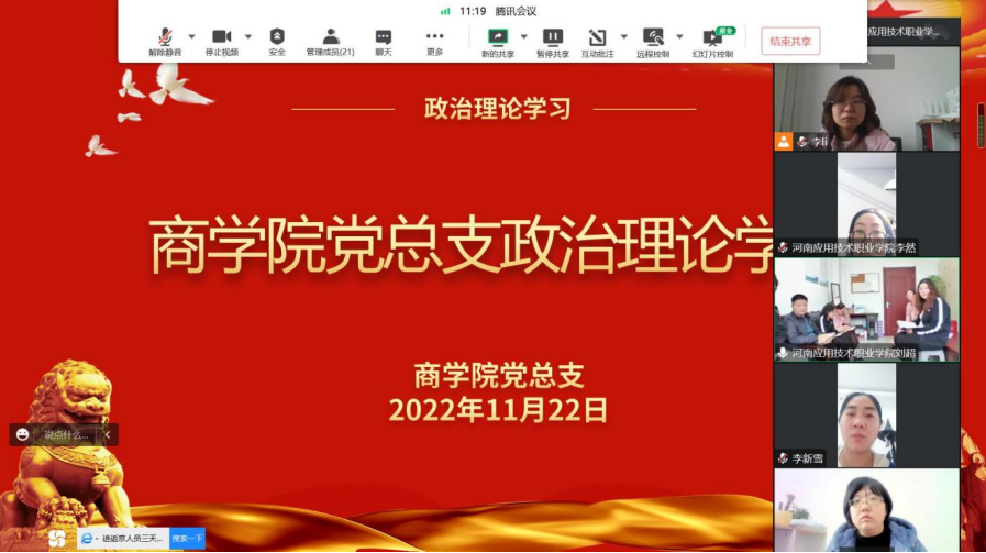 11月22日下午,必赢76net线路官网组织全体教师进行政治理论学习,本次集中学习由党总支书记苏云峰主持、党总支副书记王倩领学,通过线上线下相结合的方式进行。