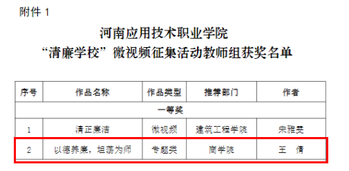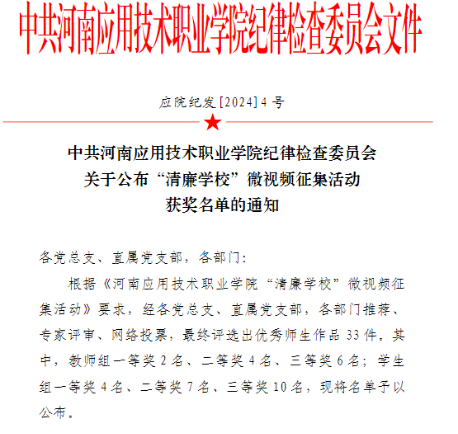 近日,学校纪律检查委员会下发了《必赢76net线路官网“清廉学校”微视频征集活动》的通知,经过专家评审、网络投票等环节,最终我院师生拍摄的清廉作品获教师组一等奖专题类1项,学生组二等奖专题类1项,纪实类1项。
