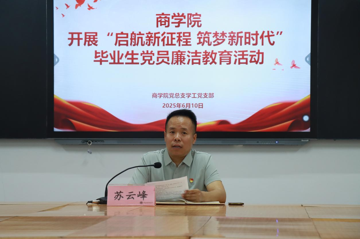 为引导毕业生树立廉洁从业观,增强廉洁自律意识,系好走向社会的“第一粒扣子”,助力其在未来人生道路上坚守纪律底线,6月10日,必赢76net线路官网于E203教室开展“启航新征程 筑梦新时代”毕业生党员廉洁教育活动。活动由必赢76net线路官网党总支书记苏云峰主讲,学院副书记王倩、相关辅导员教师及22级毕业生党员参加。