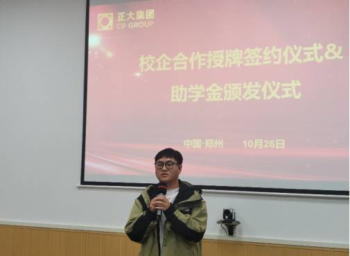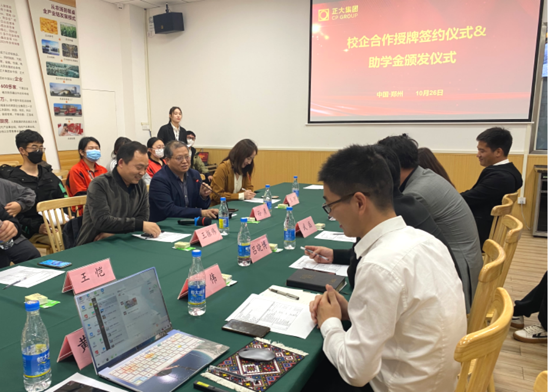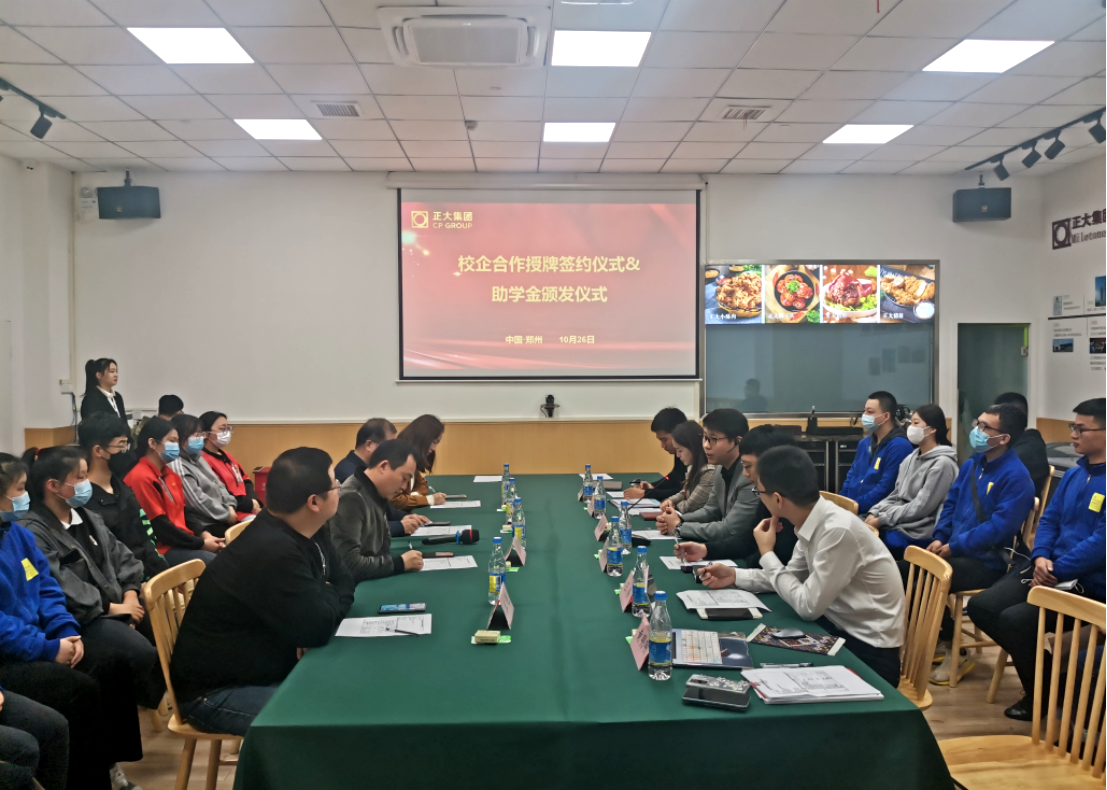 2021年10月26日下午,必赢76net线路官网与郑州正大卜蜂贸易有限公司校企合作授牌签约仪式暨助学金颁发仪式在正大卜蜂莲花举行。必赢76net线路官网院长孙勇、教务办公室主任王珂,郑州正大卜蜂贸易有限公司总经理武磊、零售事业人力总监郑运东等人,以及目前在正大顶岗实习的我院学生代表出席授牌签约仪式。