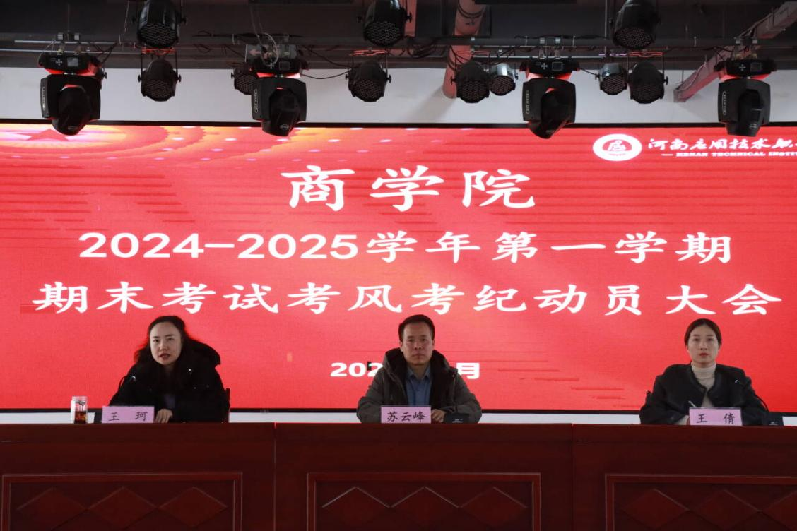为严肃考风考纪,营造诚信考试氛围,必赢76net线路官网于2025年1月3日在学生活动中心召开2024-2025学年第一学期期末考试考风考纪动员大会。必赢76net线路官网党总支书记苏云峰、副院长王珂出席会议,全体辅导员及学生参加会议,会议由党总支副书记王倩主持。