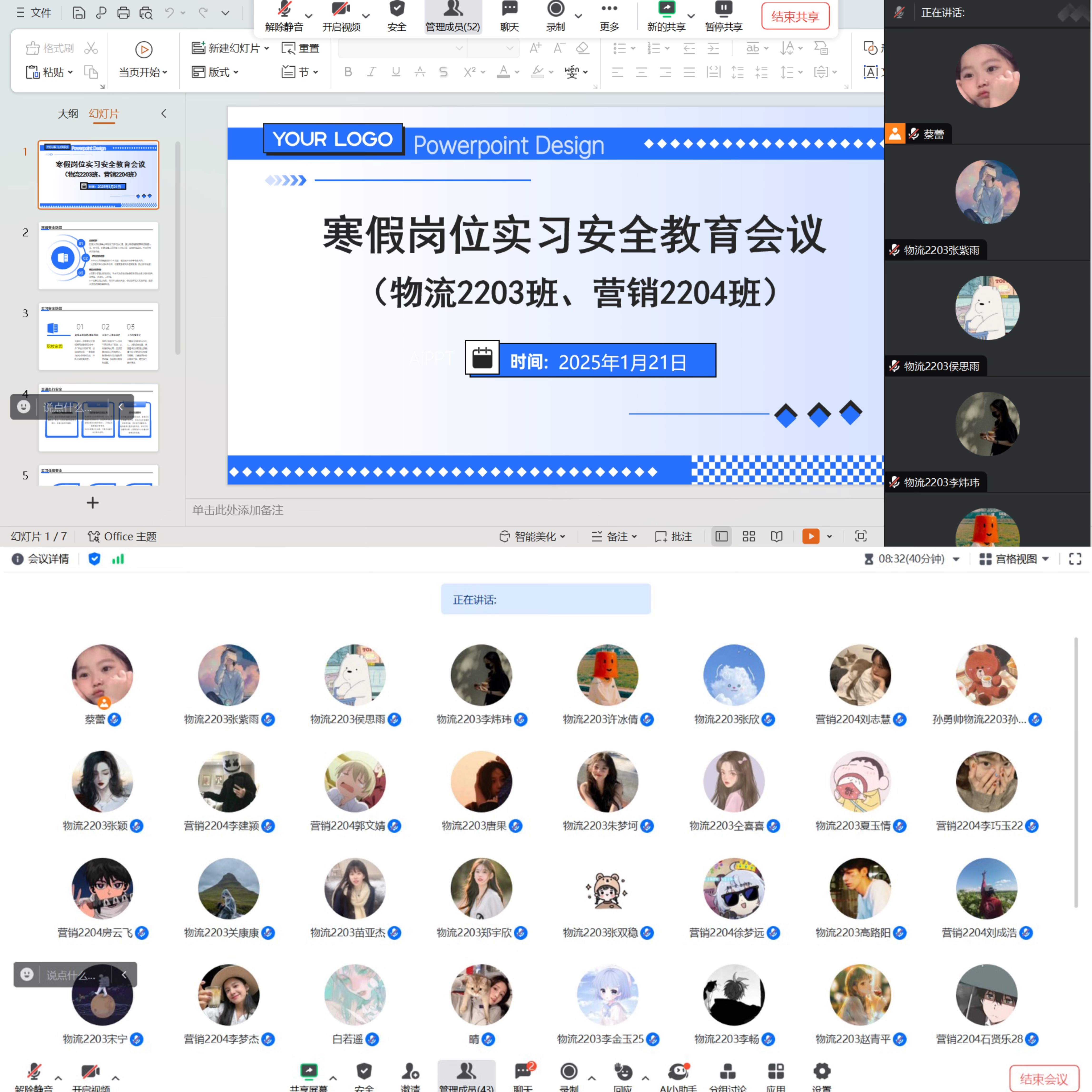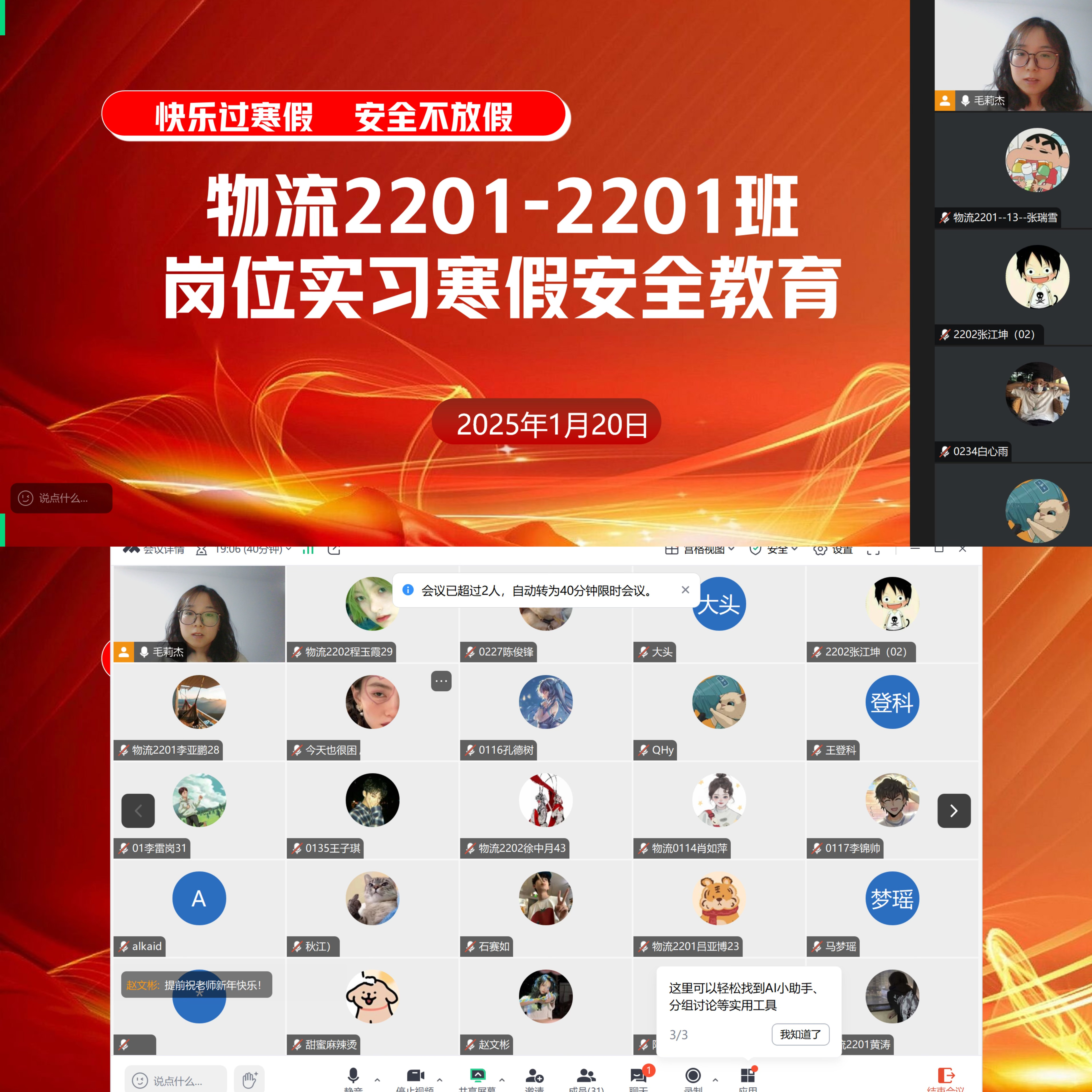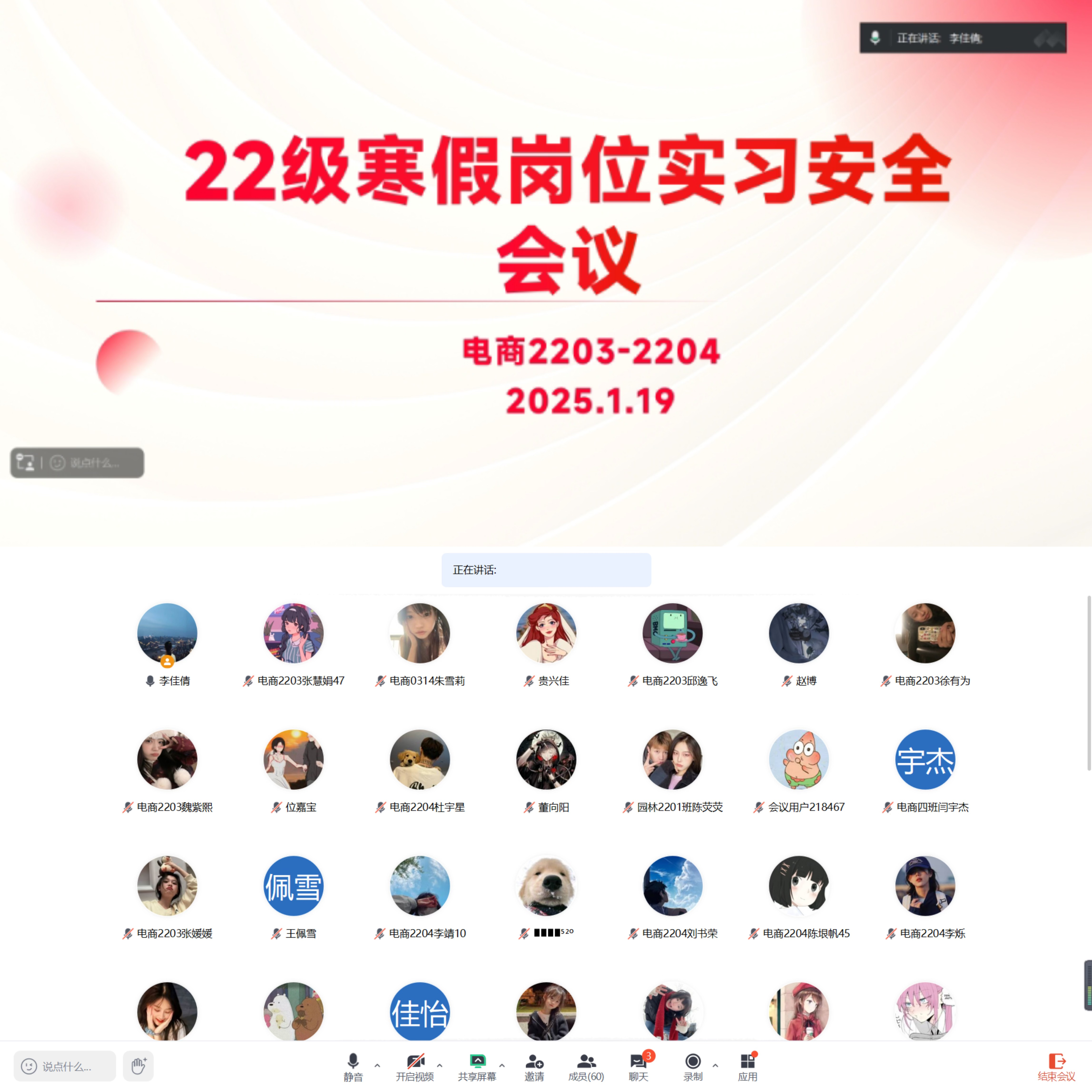 此次线上安全教育会议的召开,显著增强了2022级岗位实习学生的安全意识与自我保护能力,为同学们度过一个安全、充实的实习生活筑牢了防线。未来,必赢76net线路官网将持续关注实习学生的动态,加强与实习单位的沟通协作,助力学生顺利完成实习,积累宝贵经验,为职业发展奠定坚实基础。