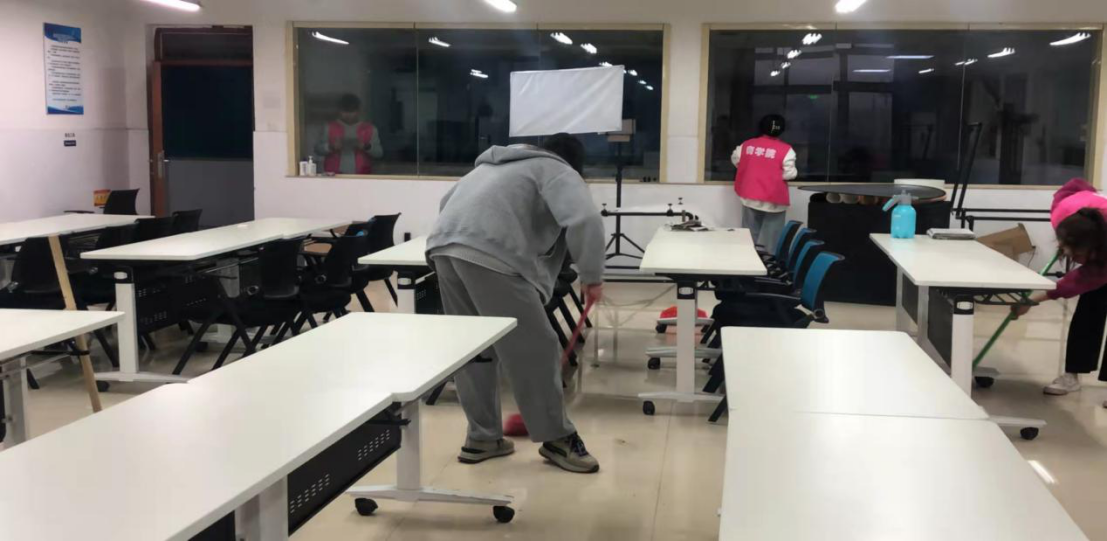志愿者擦拭实训室玻璃,力求做到窗明几净