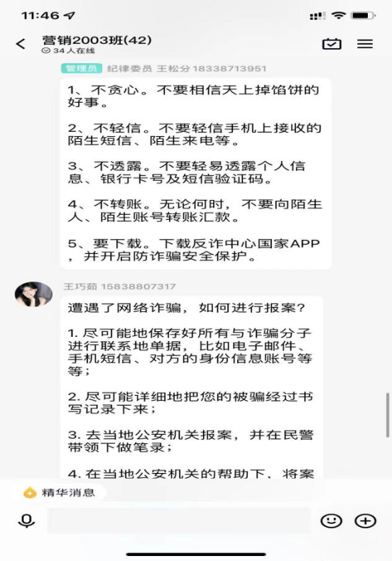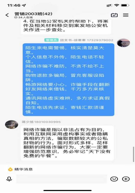 通过此次学习,同学们不仅对诈骗形式、“帮信罪”有了更深入的了解,也增强了自我防范和保护意识,切实提高了安全防范意识和避险能力。今后必赢76net线路官网也将继续重视和开展防诈骗安全教育工作,为同学们营造一个和谐美好的绿色校园。
