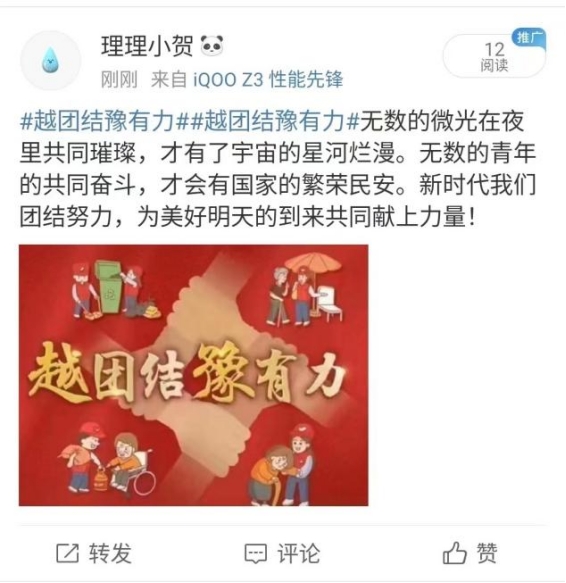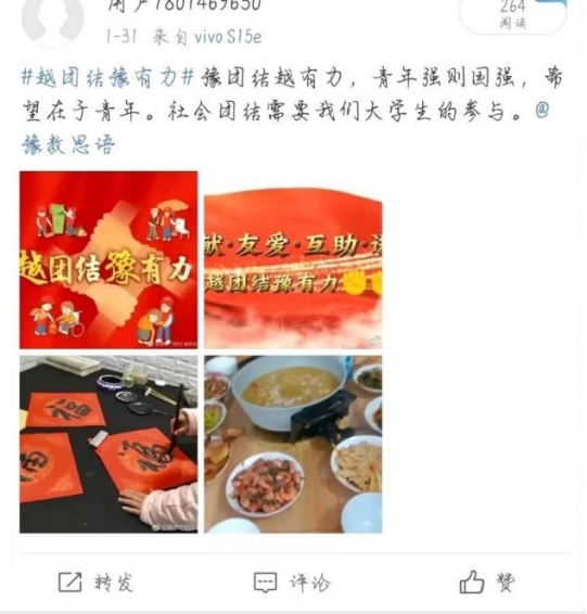 寒假期间,必赢76net线路官网开展“越团结豫有力”主题教育实践活动,不仅希望在寒冬中给同学们带去温暖,更希望在新的一年、新的学期,带给同学们力量与勇气。我们一起来看看同学们是怎么表达的吧!