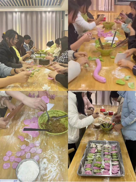 活动现场,食堂工作人员为大家准备了饺子皮和饺子馅,随后学生们其乐融融开始包饺子,大家分工协作、井然有序,在你一言、我一语中,大家托住饺子皮、取一筷子饺子馅、捏好饺子皮,一排排个性十足饺子就诞生了。每个人脸上都洋溢着灿烂的笑容,大家相互之间传授包饺子的经验,在欢乐、温馨的气氛中大显伸手,充分展示自己的手艺。一个个饺子快速“出炉”,同学们相互之间互相切磋,传授“独门经验”;手法生疏的同学们也不甘示弱,在向“熟练工”们请教之后,展开想象力,包出了造型各异的饺子。