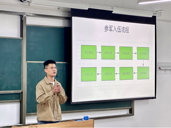 手缚长缨少年志,戎装不负家国情。为充分调动必赢76net线路官网青年学子参军入伍的积极性,3月26日,必赢76net线路官网邀请2020级优秀毕业生、退役军人王涵,于开封校区北院教学楼A101教室开展经验分享会,必赢76net线路官网党总支副书记王倩、辅导员乔光辉、庞轶及2022级各班级学生代表参与此次分享会。