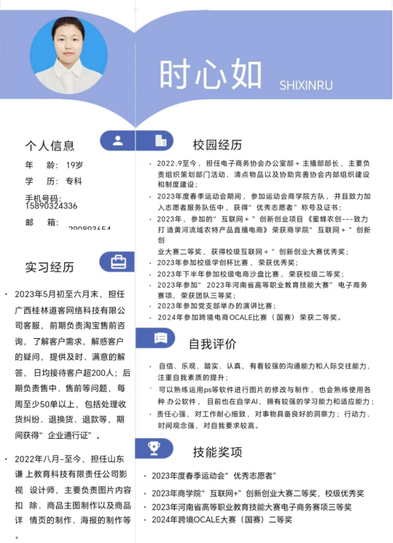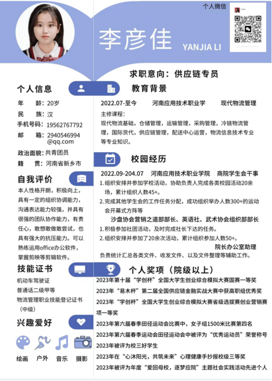 通过本次简历设计制作大赛,使同学们能够掌握简历设计及撰写要领,参赛同学的作品外观设计巧用心思,整洁美观又能凸显专业特色及个人特点。让我们一起来看看部分获奖者的优秀简历吧。