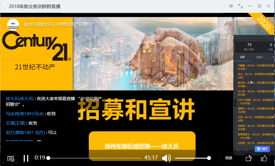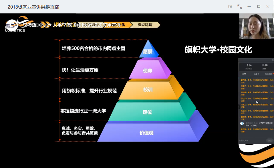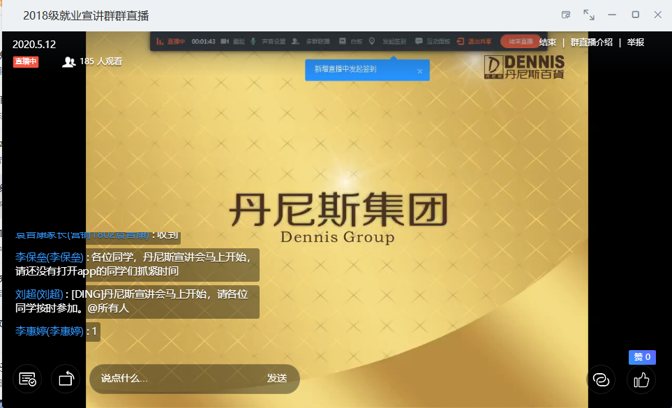 自线上云招聘开启以来,同学们反响热烈,积极参与。必赢76net线路官网多措并举,持续发力,于2020年5月12日下午举行了3场联播云招聘活动。本次招聘由丹尼斯总部人力开发处经理欧阳贞妮、河南旗帜物流有限公司人事经理李伟和21世纪郑州东南片区经理徐大兵为2018级学生做就业宣讲,必赢76net线路官网2018级400余名学生通过钉钉直播参与宣讲会。