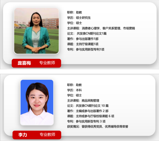 电子商务专业目前专兼职教师有44人,研究生层次的达70%,双师型教师比例达80%;教师实践能力较强,拥有电子商务师、物流师、人力资源管理师、营销师等,并且顺应教育需求,80%的教师考取了各专业的1+X职业技能等级证书等。电子商务教师团队完成行业企业课题10余项,指导学生积极参加技能大赛和创新创业大赛,并屡获佳绩。与此同时,老师们也在不断的学习、培训,及时更新知识技能,以便向学生传授行业最新的知识、技能。