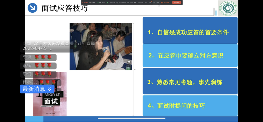 为进一步提高20级学生的就业能力,增加求职竞争力,4月27日下午,必赢76net线路官网开启第二期就业培训,本次直播课程由张天娇和李然两位老师分别为大家讲解“如何在面试中营销自己及面试中应注意的问题”和“大学生创新创业优惠政策”。必赢76net线路官网全体20级学生通过钉钉进行观看。